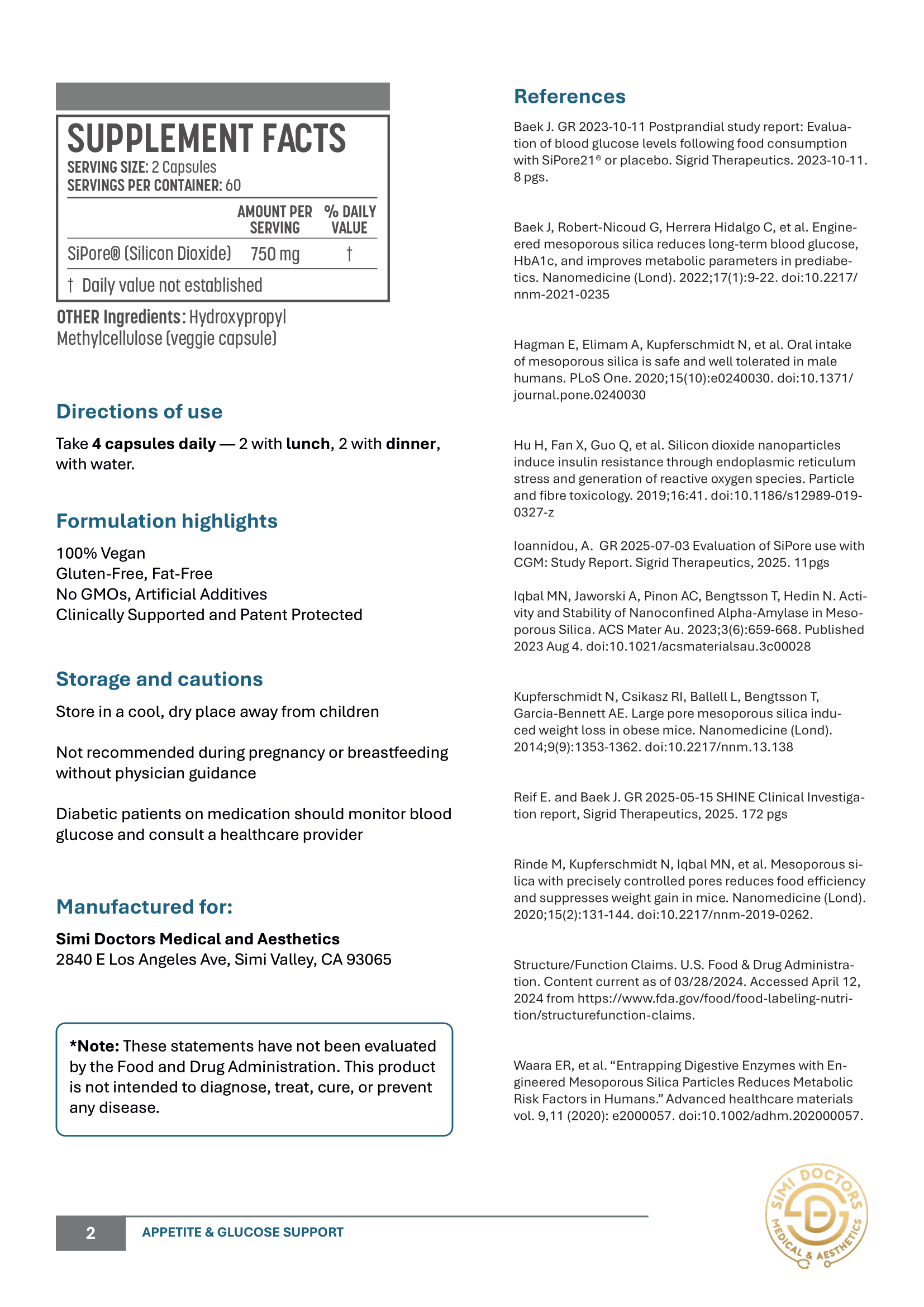 Appetite & Glucose Support features SiPore®, a clinically researched, mesoporous silica compound developed in Sweden and patented in the U.S. (US Pat. 10,695,294 & 12,121,612). With a unique structure that traps digestive enzymes, SiPore® reduces activity of α-amylase and lipase, leading to slower digestion of carbohydrates and fats*